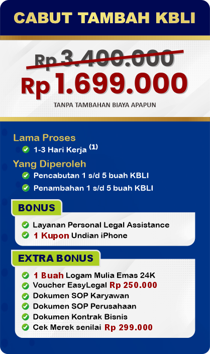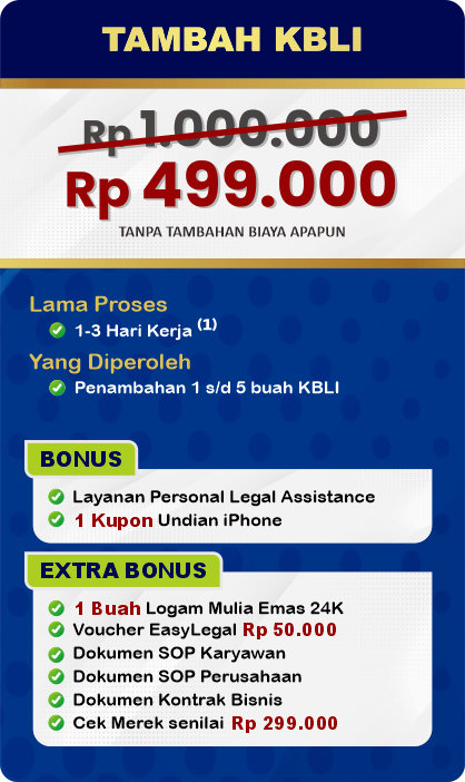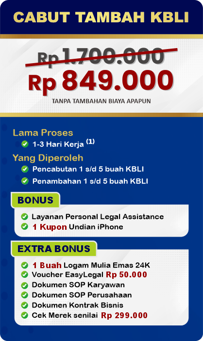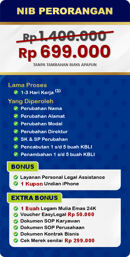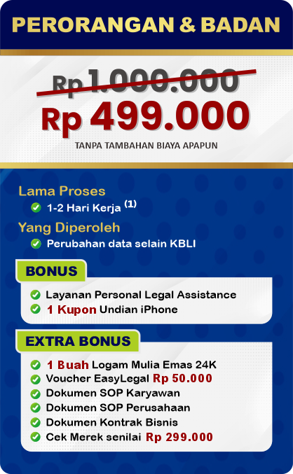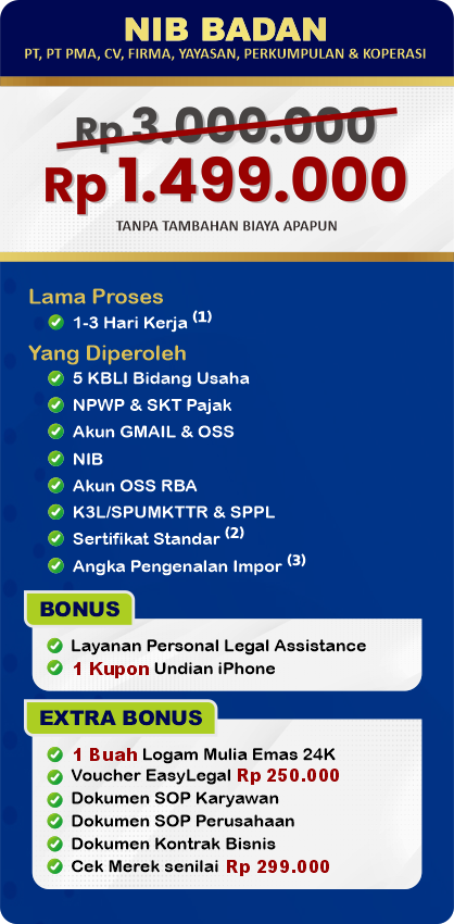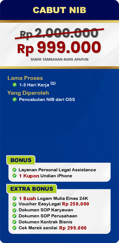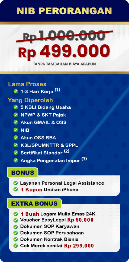 EasyLegal saat ini mengadakan Legal Festival Special Deal, sebagai bentuk dukungan untuk UMKM Indonesia. Dapatkan Diskon 50% untuk pembuatan NIB & OSS RBA. Ambil segera kesempatan ini, kuota terbatas!