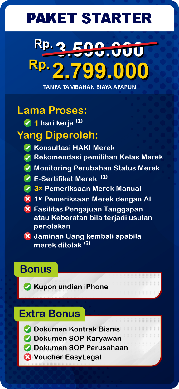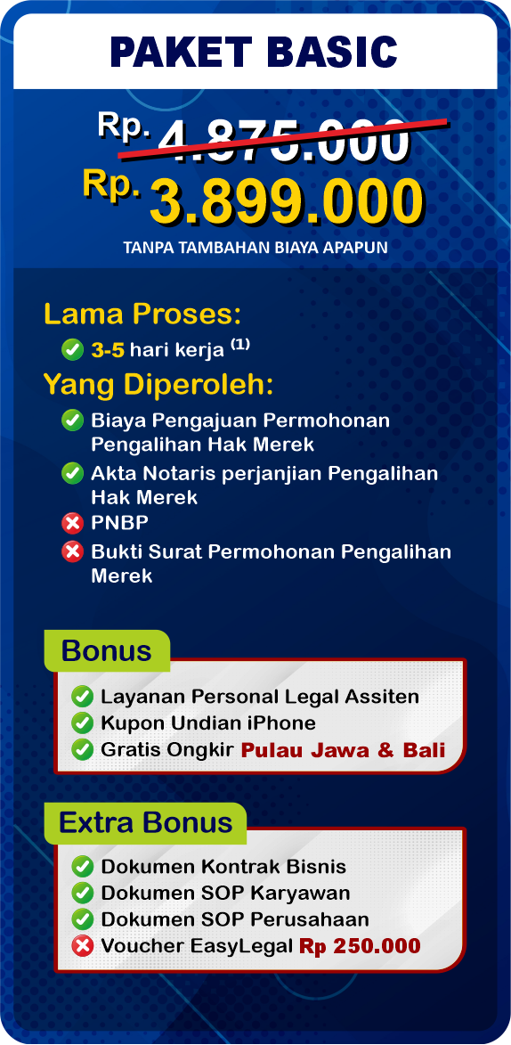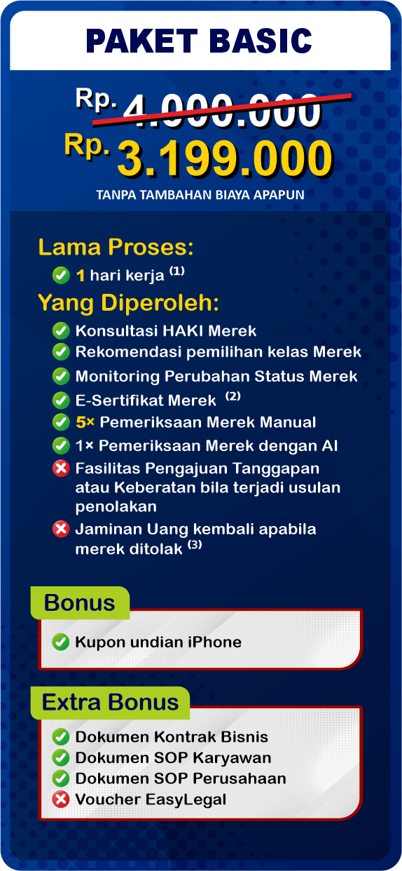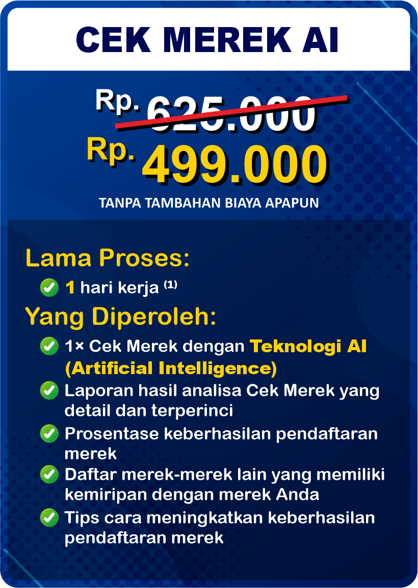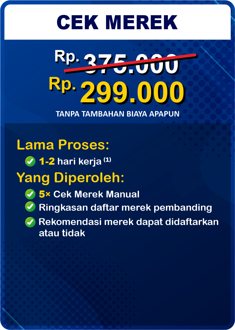 Note: ⁽¹⁾ Setelah draft pendaftaran merek disetujui | ⁽²⁾ Sertifikat merek diterbitkan setelah merek dinyatakan berhasil pada masa pengumuman, berlangsung sekitar ± 6 hingga 18 bulan | ⁽3⁾ Syarat dan ketentuan berlaku | ⁽*⁾ Harga diatas tidak termasuk biaya pengajuan banding bila terdapat keputusan penolakan merek