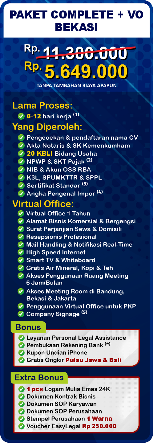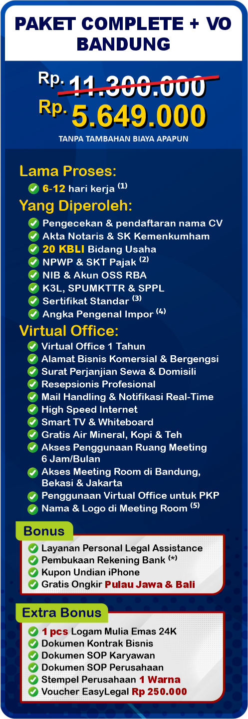 Note:⁽¹⁾ Setelah tanda tangan Minuta Akta | ⁽²⁾ SKT Pajak dikirim oleh KPP dalam 1-3 bulan | ⁽³⁾ Resiko menengah rendah | ⁽⁴⁾ Opsional | ⁽⁵⁾ Saat penggunaan Meeting Room | ⁽*⁾ Syarat & Ketentuan Berlaku