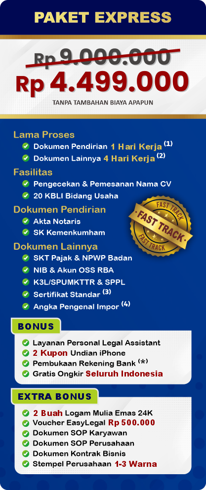 Pendirian CV di Indonesia dapat meningkatkan reputasi bisnis dan menawarkan kemudahan pengelolaan, sekaligus membuka peluang pertumbuhan. Ideal untuk usaha kecil hingga menengah, memungkinkan pengembangan usaha dengan pendekatan yang lebih dinamis dan responsif. EasyOffice sebagai jasa pendirian CV saat ini mengadakan Legal Festival Special Deal, sebagai bentuk dukungan untuk UMKM Indonesia.