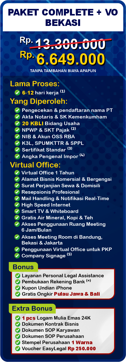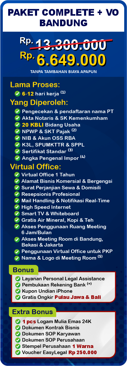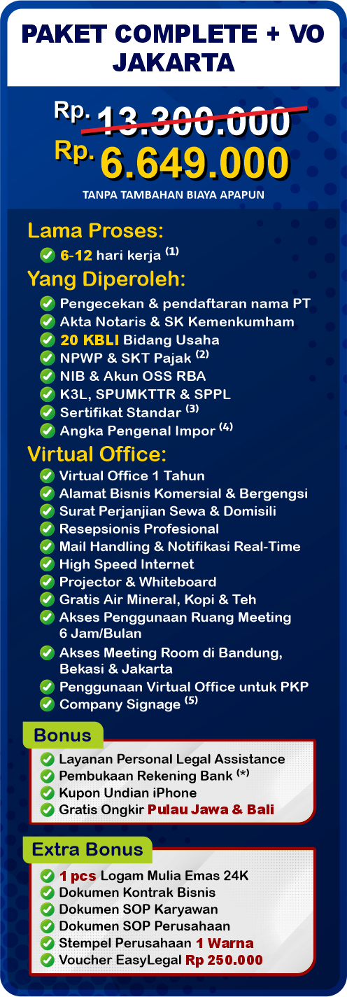 Pendirian Perseroan Terbatas (PT) di Indonesia tidak hanya meningkatkan reputasi bisnis Anda, tetapi juga memberikan perlindungan hukum serta membuka peluang untuk pertumbuhan dan perkembangan lebih lanjut. EasyOffice sebagai jasa pembuatan PT saat ini mengadakan Legal Festival Special Deal, sebagai bentuk dukungan untuk UMKM Indonesia.
