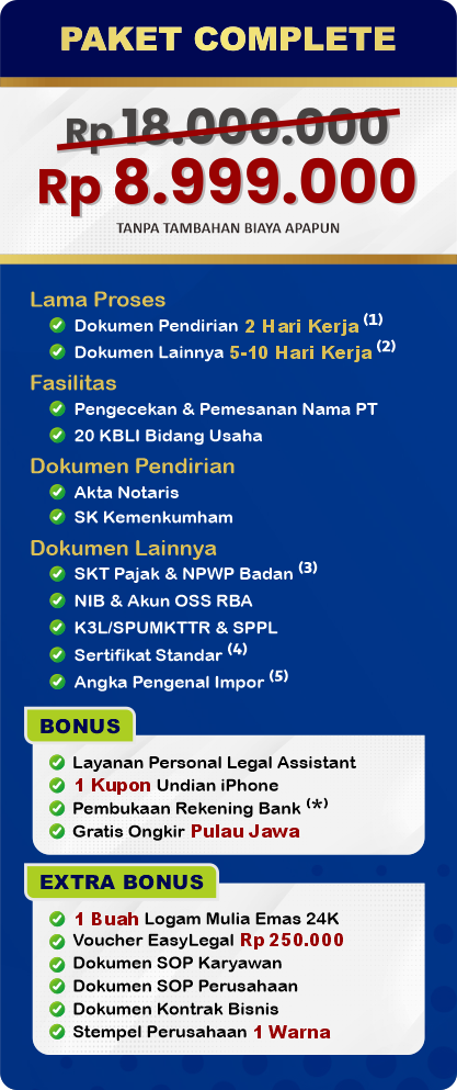 Setelah proses ini selesai, pendiri PT akan menerima salinan Akta Pendirian dan SK Pengesahan dari Menteri. Layanan EasyOffice memastikan proses ini dapat diselesaikan dengan cepat, menargetkan penyelesaian hanya dalam waktu 2 hari kerja, memudahkan dan mempercepat legalitas pendirian perusahaan Anda.