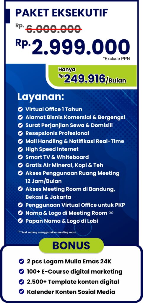 Virtual office bandung yaitu salah satu penyedia sewa kantor virtual termurah dan bisa melakukan PKP. Dengan fasilitas kawasan yang lengkap bersama brand – brand ternama seperti KFC, Hokben, Chatime selain itu lokasinya sangat strategis karena dekat tol sumarecon dan kereta cepat whoosh.